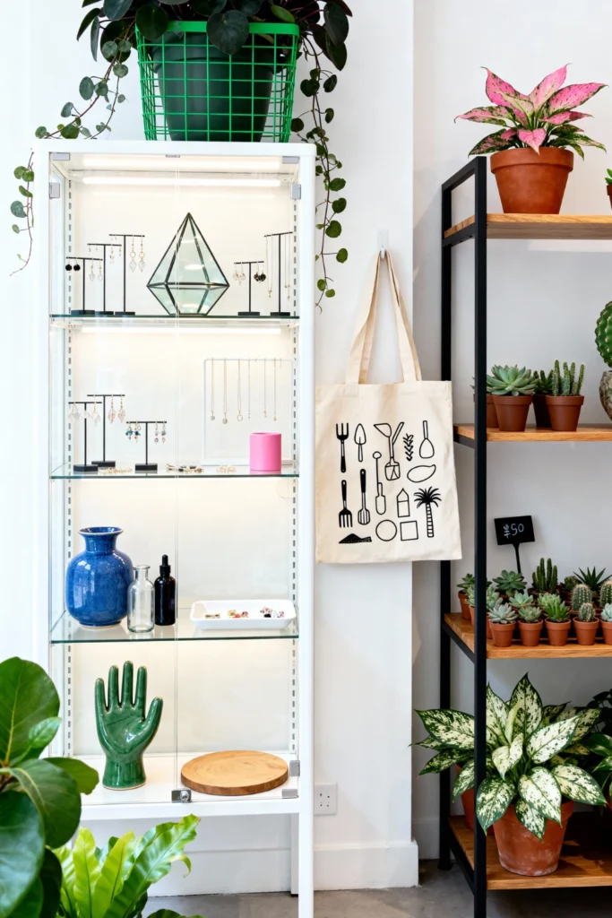 Opt for a sleek, glass-front display cabinet to showcase your delicate jewelry or collectibles under integrated lighting. Place a tall, industrial-style wood and metal shelving unit nearby to hold an array of potted succulents and leafy plants. Hang a canvas tote bag on the wall for a casual, utilitarian touch. Mix natural terracotta pots with green ceramics to create a cohesive but varied look. Keep the walls stark white to let your greenery and curated items truly pop without visual clutter.