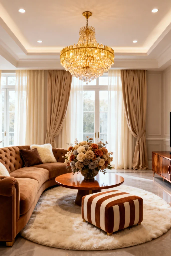 Choose a curved, velvet sofa in a rich caramel or rust tone to warm up the space. Hang heavy, beige drapes that pool slightly on the floor for a sense of traditional grandeur. Illuminate the space with a massive, gold-tiered chandelier that commands attention. Place a large, round ottoman with bold stripes near a polished wood coffee table. Fill a vase with autumnal-colored roses to complement the warm, inviting, and opulent color scheme.