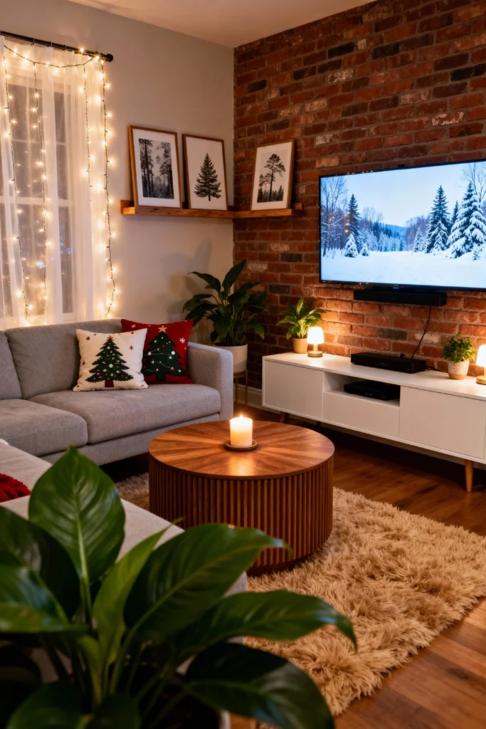 Expose a brick wall to give the room a warm, industrial texture that feels lived-in. Drape fairy lights over sheer white curtains to create a magical, twinkling backdrop. Place festive, tree-patterned pillows on a comfortable grey sofa to embrace the season. Choose a round, fluted wooden coffee table to soften the angular lines of the room. Add warm wood floating shelves with black and white nature photography to complete this cozy, winter-ready cabin vibe.