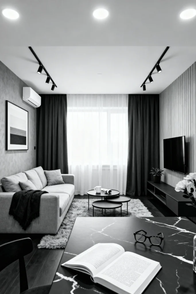 Stick to a strict black, white, and grey color palette for a sharp, contemporary look. Install black track lighting on the ceiling to highlight specific zones without clutter. Choose a grey fabric sofa with clean lines and pair it with nesting black round coffee tables. Use a vertical slat wall behind the TV to add architectural texture without adding color. Hang a large, abstract black and white print to serve as the room’s artistic focal point.