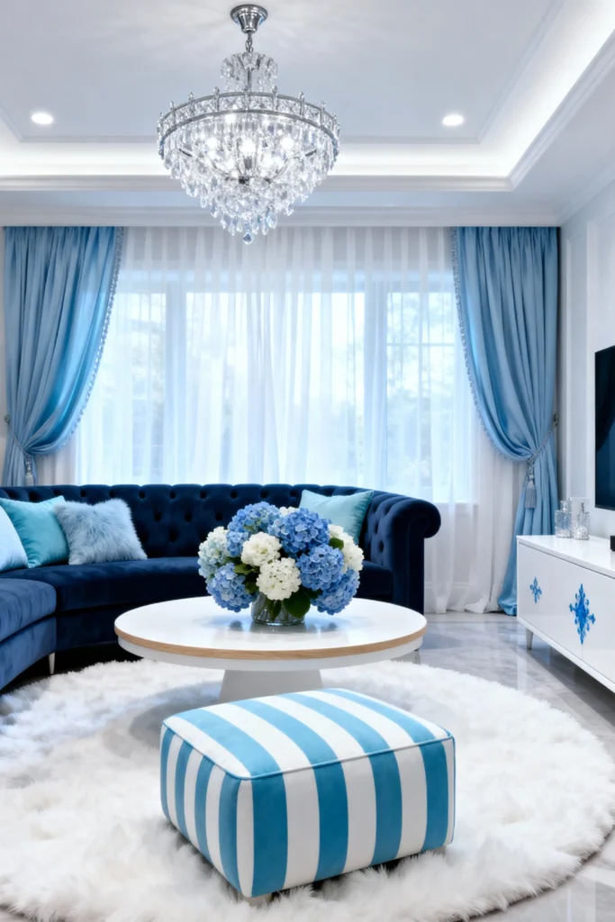 Choose a curved, tufted velvet sectional in a deep royal blue for a major statement piece. Pair it with floor-to-ceiling silk drapes in a matching shade to create serious drama. Center the room with a crisp white round table and a playful striped ottoman for a sharp contrast. Install a sparkling crystal chandelier to reflect light across the polished marble floors. Add a massive bouquet of blue and white hydrangeas to bring freshness to this luxurious, cool-toned palette.