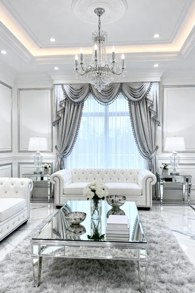 Select a tufted, white leather sofa with silver stud detailing for an unapologetically high-end feel. Drape heavy, silver-grey curtains with intricate valances to frame the window theatrically. Use mirrored furniture, like the coffee table and side tables, to bounce light around the room and expand the space. Center a grand, tiered crystal chandelier to act as the room’s crown jewel. Keep the accessories monochromatic—silver bowls and white roses—to maintain this pristine, icy aesthetic.