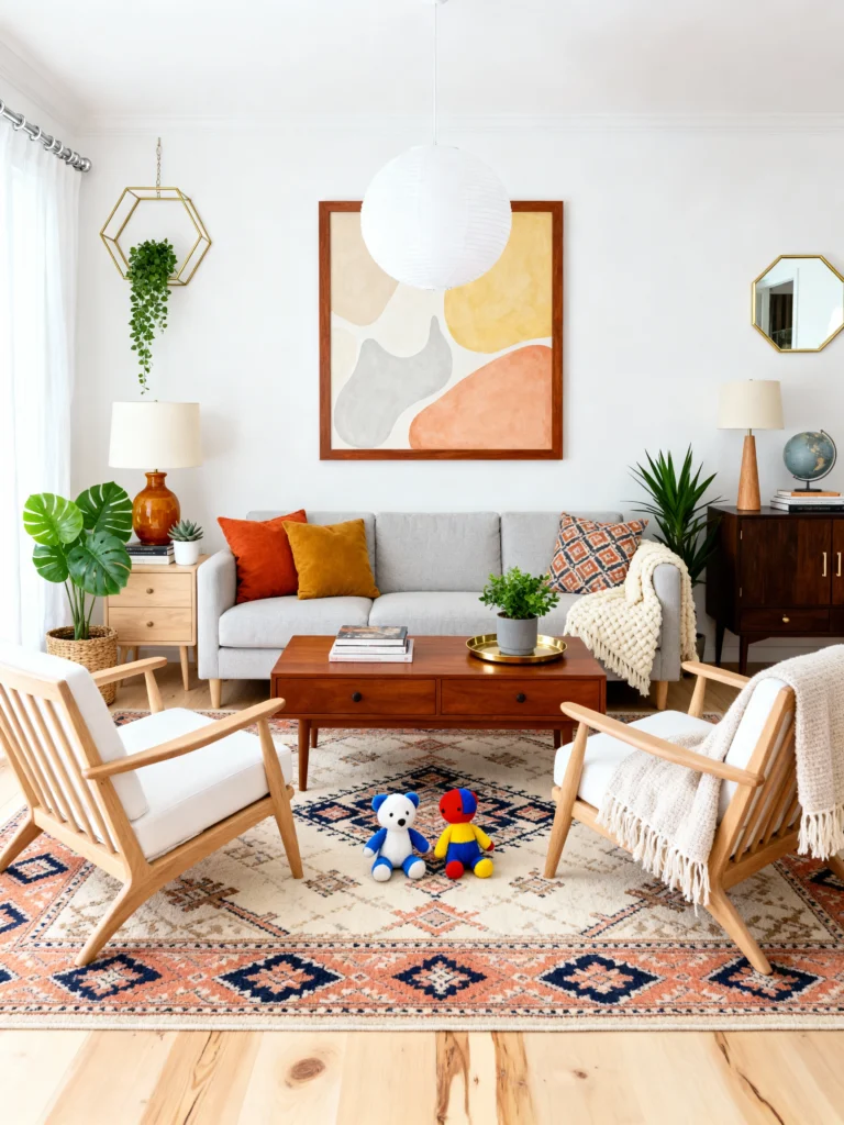 Start with a light grey mid-century sofa as your neutral base. Pile on throw pillows in warm tones like burnt orange, mustard, and rust. Hang a large, abstract canvas featuring organic shapes and earth tones above the sofa. Place a geometric, diamond-patterned rug to anchor the seating area. Use light wood armchairs with white cushions to keep the room feeling airy. Don’t forget to hang a trailing plant or two—greenery is essential for this look. Finish with a rich wooden coffee table with drawer storage.