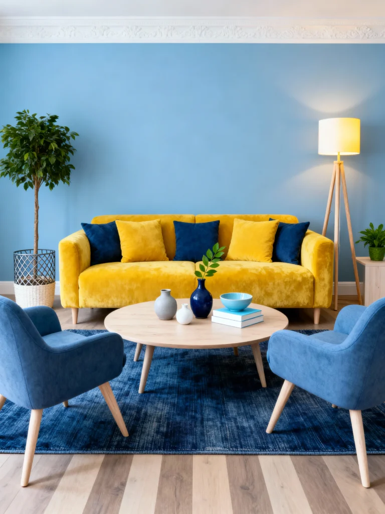 Paint your main wall a smooth, calming shade of sky blue to set a serene backdrop. Choose a bold, mustard-yellow velvet sofa to create a stunning focal point that pops against the blue. Flank the sofa with two matching blue armchairs to balance the visual weight of the room. Opt for a tall, minimalist wooden tripod lamp to add height and warm light. Place a large indoor tree in a woven basket to bring a touch of nature indoors. Keep the coffee table round and light to maintain a spacious flow.