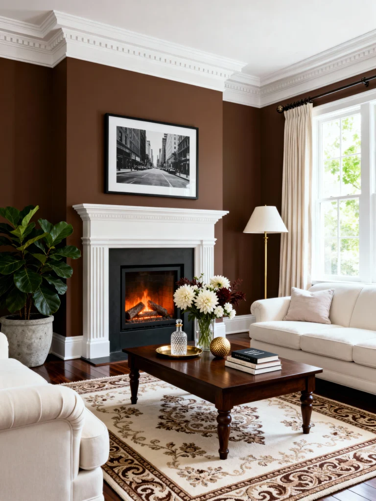 Don’t be afraid of the dark side; paint your walls a rich, chocolate brown for instant drama. Keep the fireplace mantel and window trim a crisp, bright white to create high contrast. Select a plush, cream-colored sofa to soften the room and keep it from feeling too heavy. Lay down a traditional beige floral rug to add elegance underfoot. Hang a large, framed black and white photograph above the fireplace for a modern touch. Use a dark wood coffee table to tie the rich wall color into the center of the room.