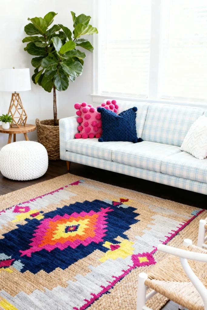 Have a little fun by choosing a sofa with a subtle light blue plaid pattern. Pair it with a bold, vibrant rug featuring hot pink and navy blue geometric designs. Add playful throw pillows with textures like pom-poms or tassels in pink and navy. Place a large fiddle leaf fig tree in a woven basket next to the sofa for height. Keep the side tables small and wooden to let the colors do the talking. Use a white knitted pouf for an extra touch of whimsy.