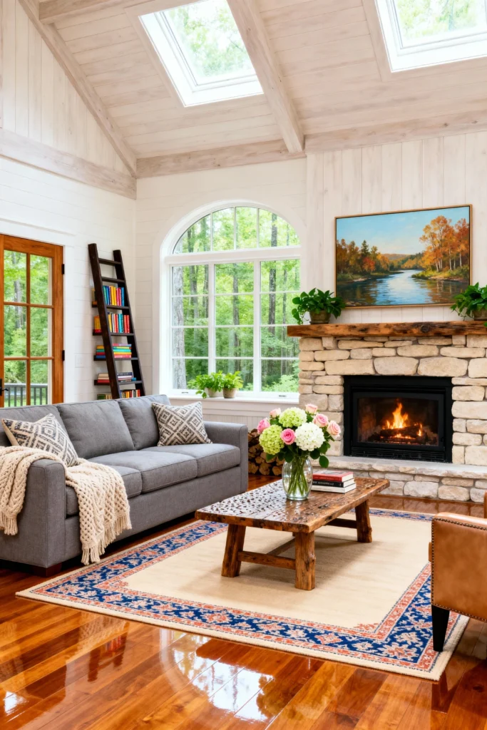 Center your room around a grand stone fireplace to anchor the space with natural texture. Pick a simple, clean-lined charcoal sofa that doesn’t compete with the view. Use a raw-edge, rustic wooden coffee table to emphasize the cabin-like charm. Keep the walls and ceiling white to let the light pour in from the high windows. Add a large landscape painting above the mantle to reflect the outdoors. finish the look with a patterned area rug in traditional reds and blues to warm up the wooden floors.