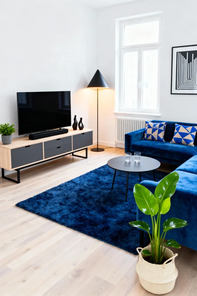 Create a monochromatic sanctuary by choosing a deep blue velvet sofa. Match it with a plush, dark blue area rug to define the lounge zone comfortably. Keep your media console sleek with a mix of light wood and matte black drawer fronts. Use a black cone floor lamp to cast a warm, directional glow in the corner. Add a large bird of paradise plant in a woven basket to break up the blue with fresh green. Keep the walls stark white to ensure the room feels bright despite the dark furniture.