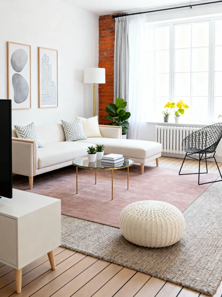 Embrace the character of your space by leaving a brick wall exposed for that cool, industrial texture. Soften the rough edges with a large, dusty pink area rug that covers most of the floor. Choose a sleek, cream-colored sectional sofa with clean lines for lounging. Add a glass-topped coffee table with gold legs to keep the visual footprint light. Throw in a chunky, cream knit pouf for flexible, casual seating. Hang minimalist black-and-white art prints to keep the vibe modern and uncluttered.
