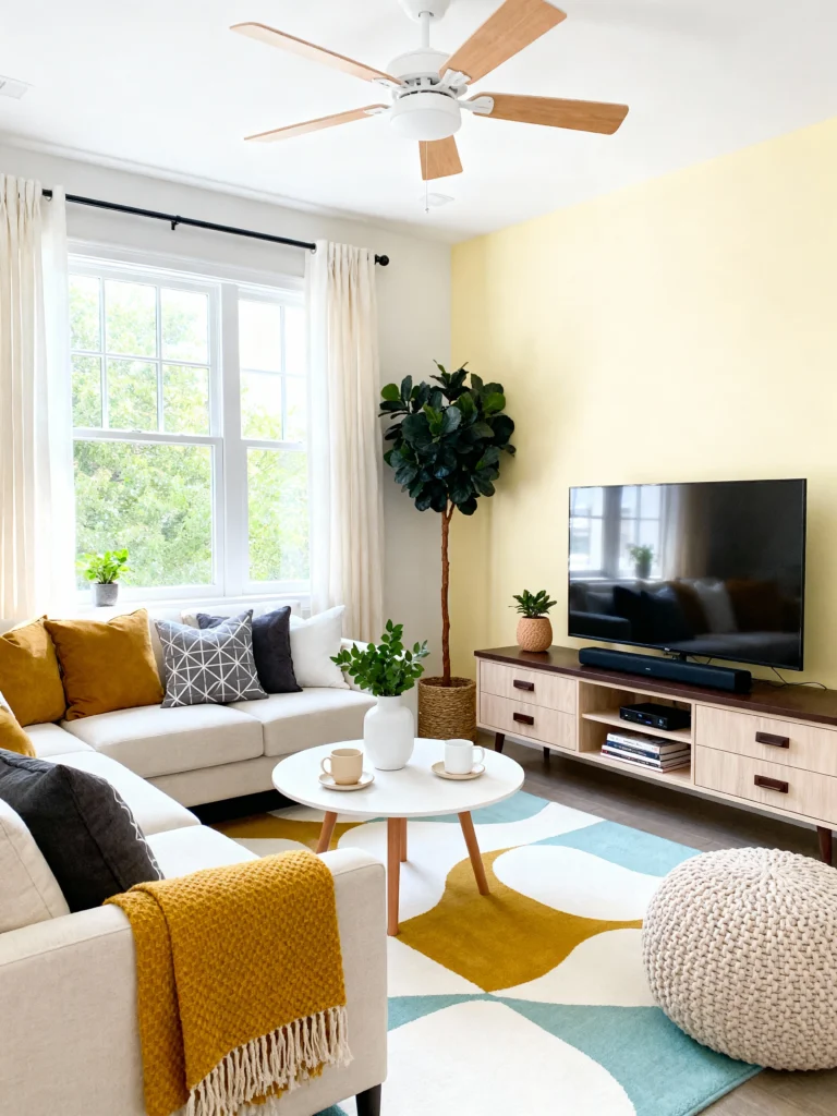 Paint a feature wall in a soft, pastel yellow to instantly cheer up the space. Choose a fun, graphic rug with large teal, white, and mustard shapes. Keep your sofa neutral in a light beige fabric to balance the colorful rug. Add a modern, low-profile TV stand in light wood with dark hardware. Finish with a tall indoor tree in a woven basket to fill the corner. Use a round white coffee table to keep the flow easy and kid-friendly.