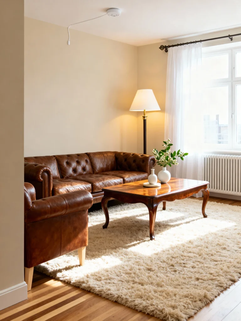 Invest in a classic, tufted brown leather sofa that adds instant sophistication. Pair it with an elegant, curved wooden coffee table with a polished finish. Place a fluffy, cream-colored rug underneath to provide a soft contrast to the smooth leather. Let natural light stream through sheer white curtains to keep the mood airy. Keep the walls a warm beige to maintain a cozy, traditional atmosphere. Add a simple white vase with fresh greenery to the table for a breath of life.