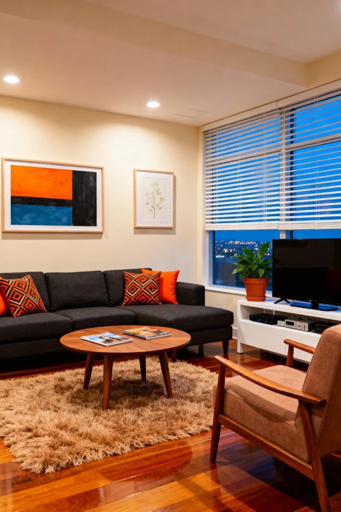 Frame your city view with clean, white horizontal blinds. Opt for a dark charcoal sectional sofa to create a cozy corner for watching movies. Contrast the sleek furniture with a high-pile, caramel-colored shag rug for serious texture. Add a round, mid-century wooden coffee table to soften the angles of the room. Pop in some bright orange throw pillows to energize the space against the dark upholstery. Keep your media unit low and white to maintain a modern, streamlined aesthetic.