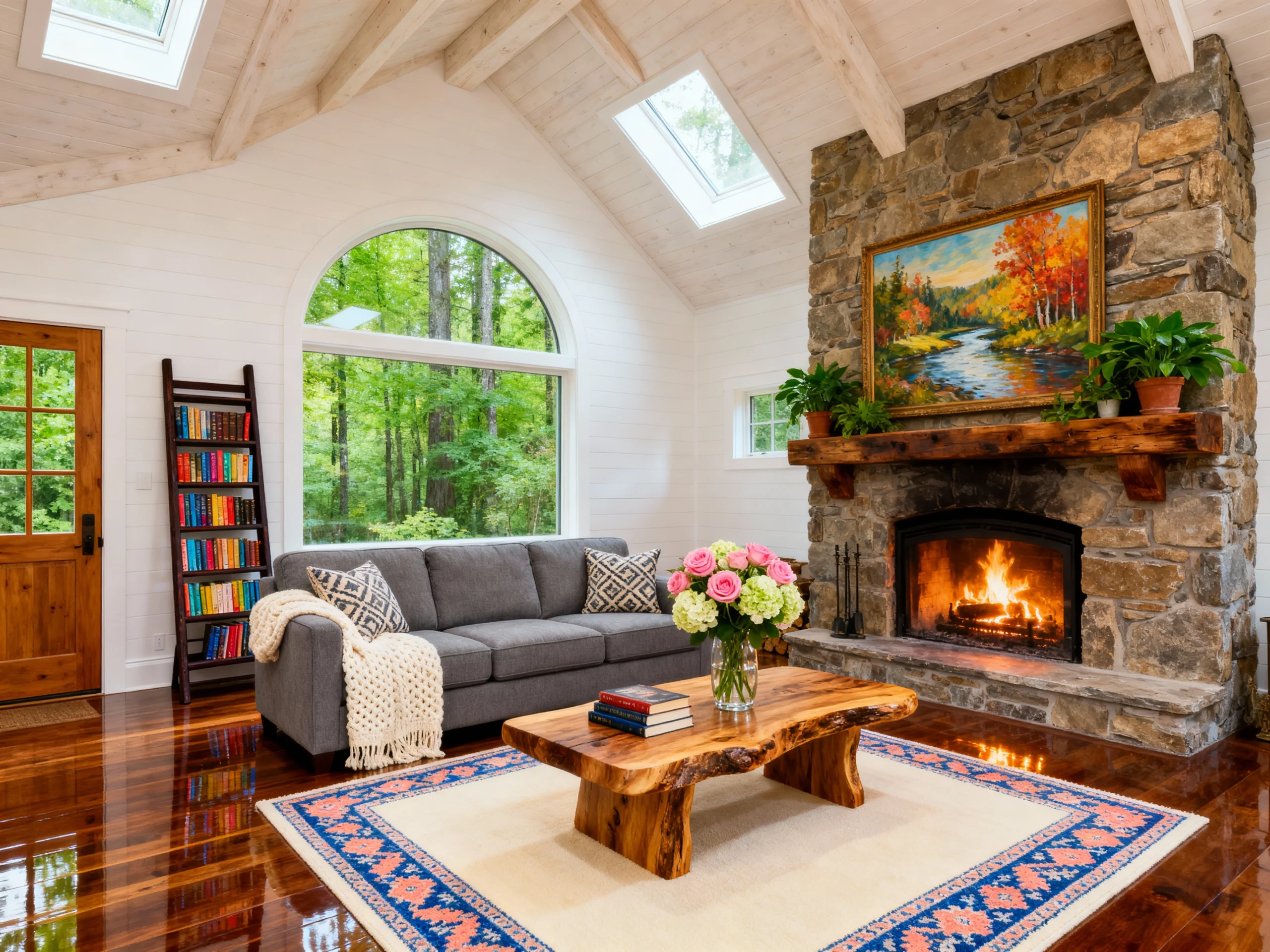 Center your room around a grand stone fireplace to anchor the space with natural texture. Pick a simple, clean-lined charcoal sofa that doesn’t compete with the view. Use a raw-edge, rustic wooden coffee table to emphasize the cabin-like charm. Keep the walls and ceiling white to let the light pour in from the high windows. Add a large landscape painting above the mantle to reflect the outdoors. finish the look with a patterned area rug in traditional reds and blues to warm up the wooden floors.