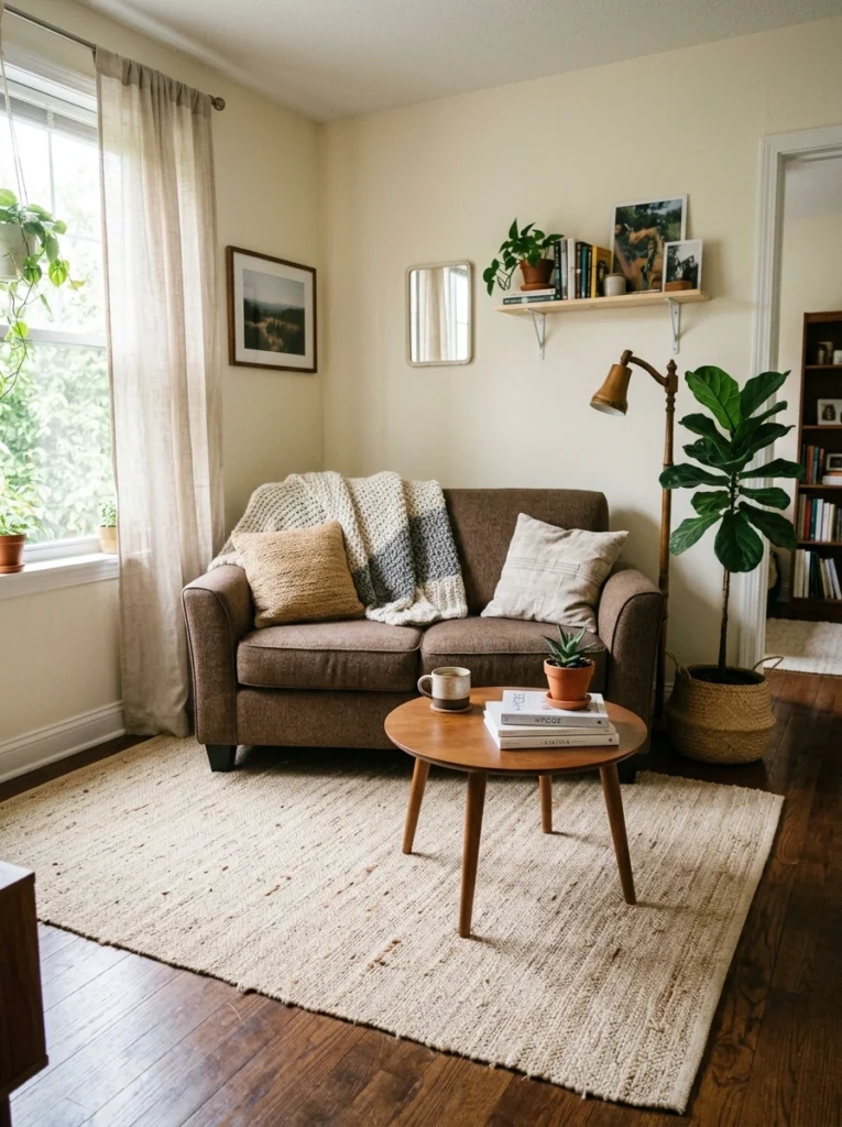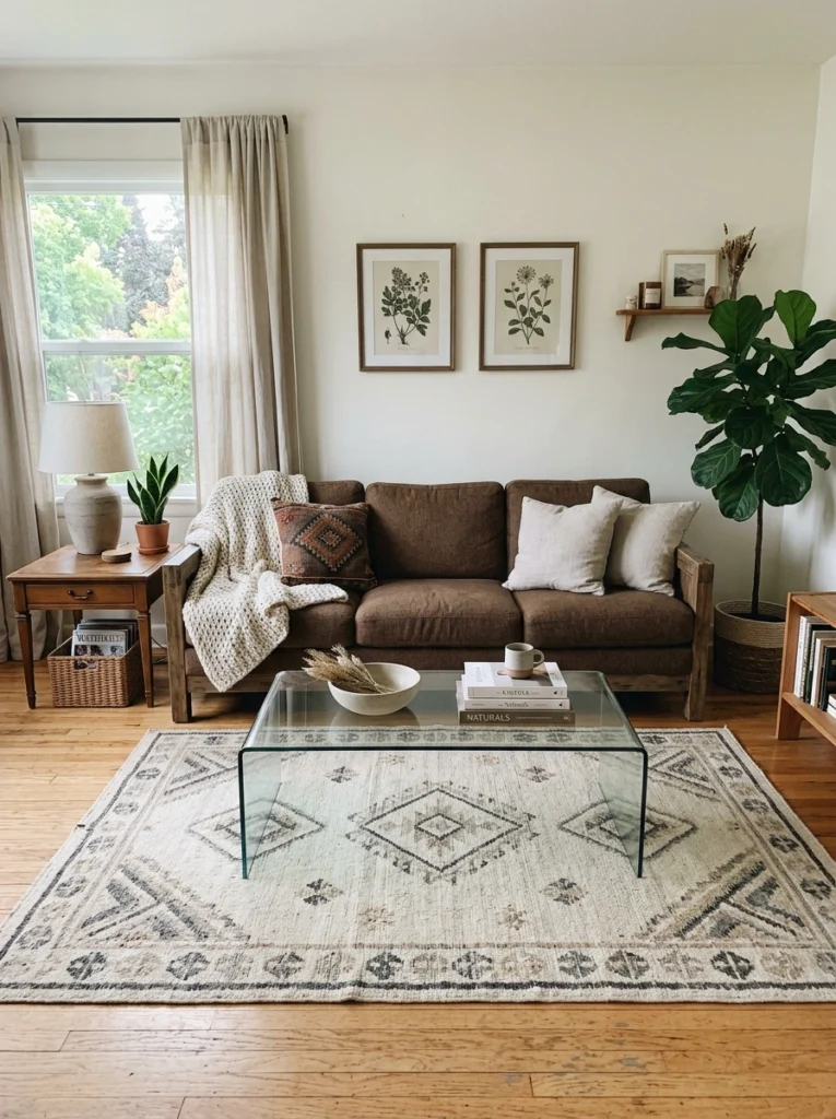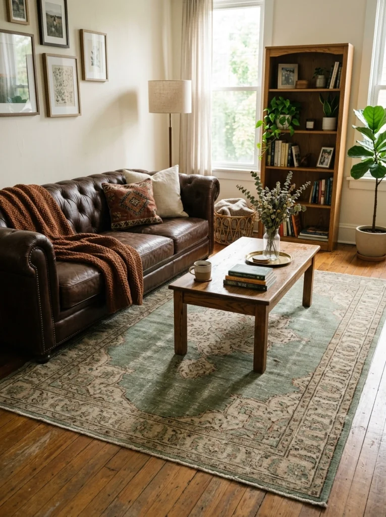 If space is tight, stick to lighter rug colors (like ivory or soft gray) and very subtle patterns. Dark rugs absorb light and can make a small room feel boxed in, especially when paired with a heavy brown couch. A light, airy rug tricks the eye into thinking the floor space is expansive.