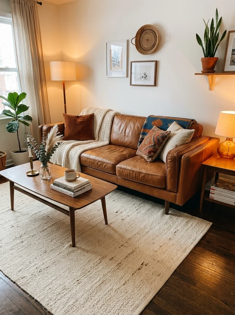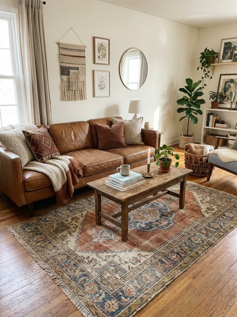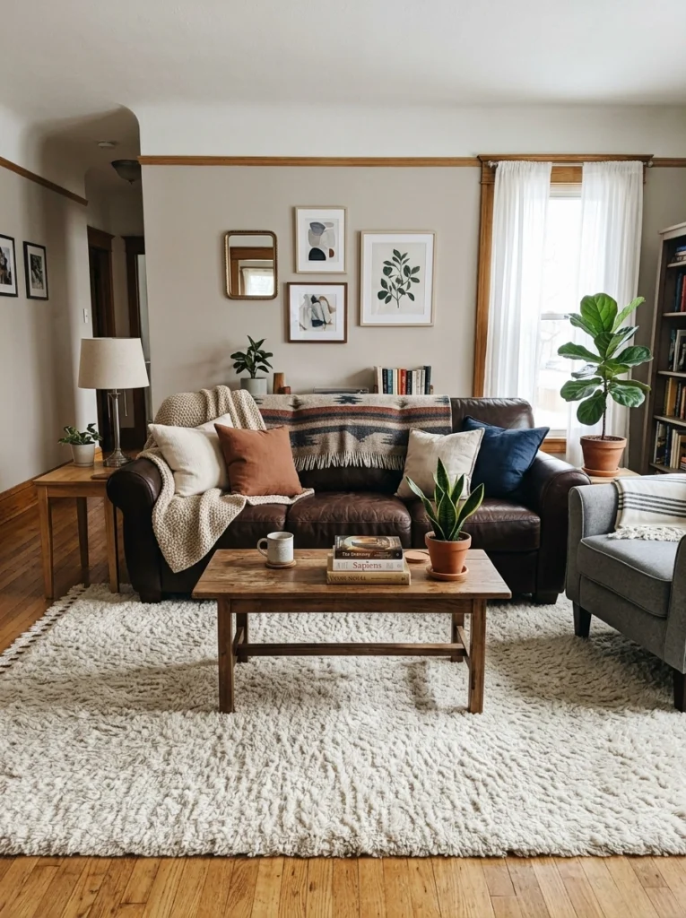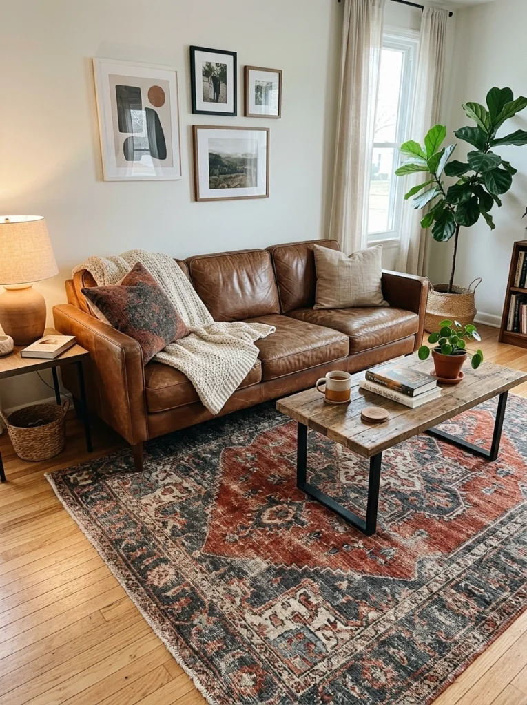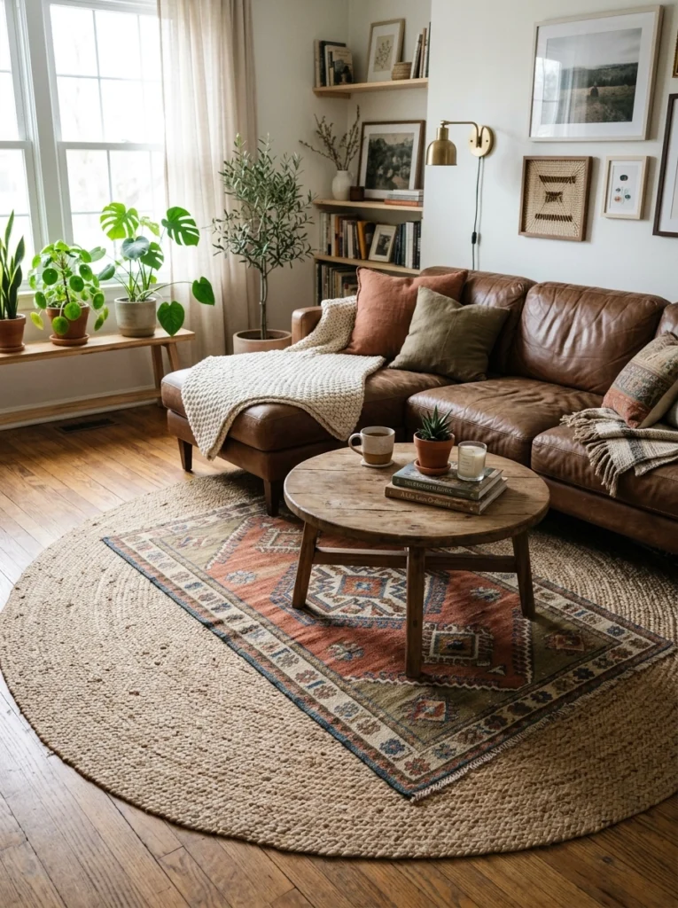 If you decide to stick with a solid neutral rug, the texture has to do the talking. Mixing materials is the secret to cozy couch styling. A chunky woven jute rug brings relaxed, coastal-meets-farmhouse vibes. A wool-look flatweave keeps things sharp and minimalist, while a plush or shag rug adds serious tactile comfort that softens the hard lines of a brown leather sofa.