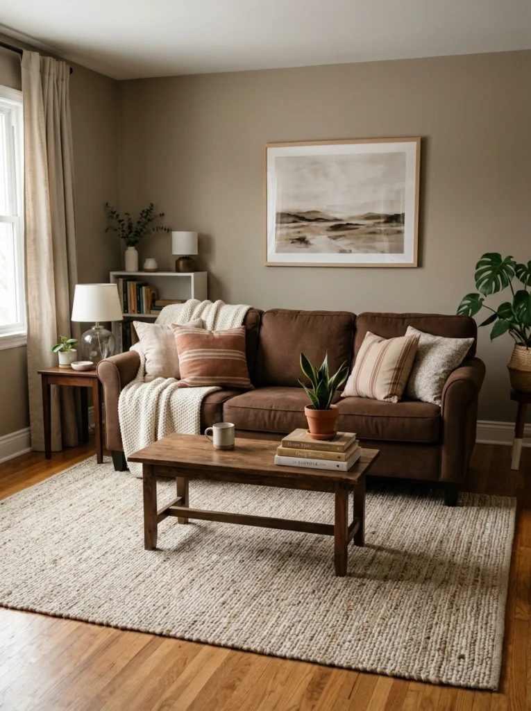 Brown is fundamentally an earth tone, so it naturally plays well with colors found in nature. A muted sage green rug creates a highly relaxing, organic vibe, while a soft, dusty blue rug adds a touch of cool serenity that balances out the warmth of the brown. This is a foolproof way to add color without overwhelming the eye.