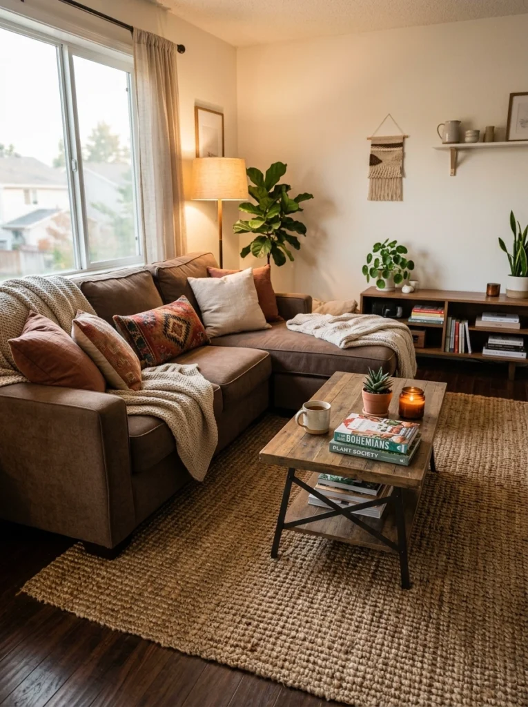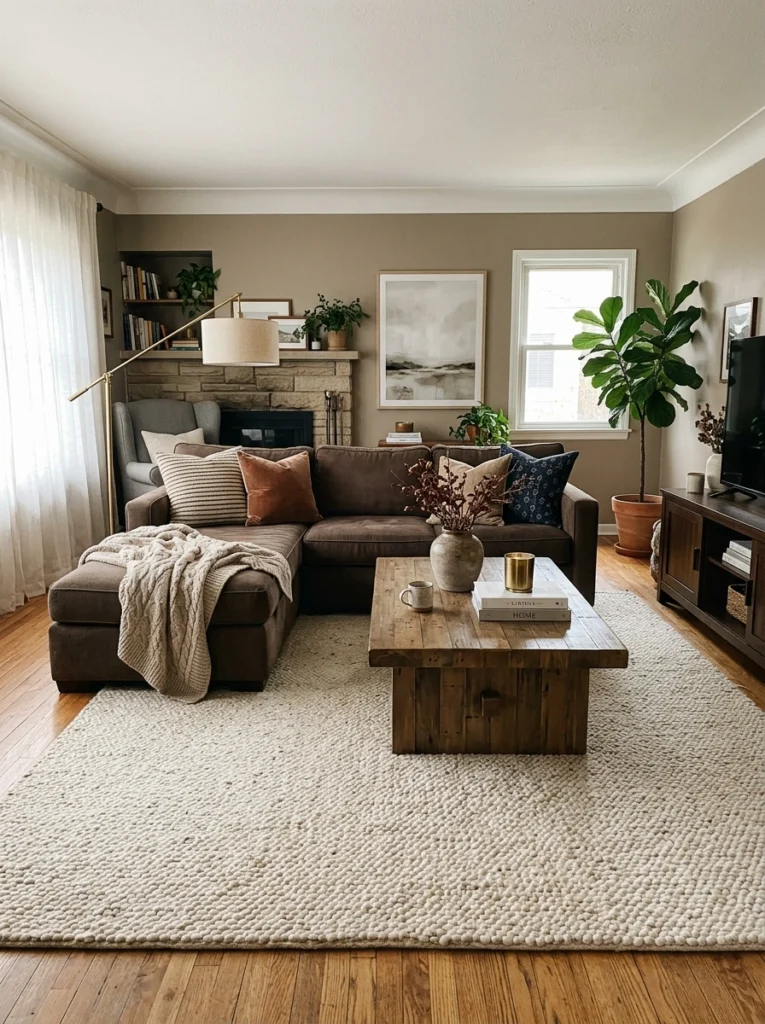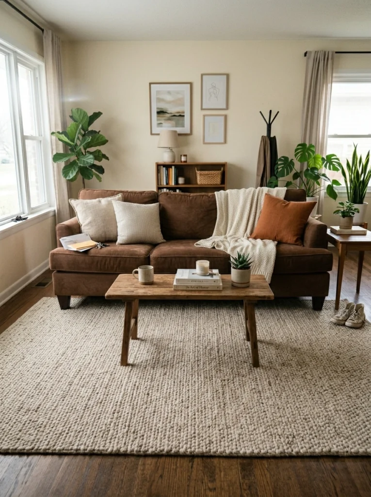 A tiny rug will make your living room look smaller and disconnected. When your looking at rug sizes, bigger is usually always better. At an absolute minimum, the front legs of your brown sofa and any accent chairs need to sit fully on the rug. This anchors the furniture and establishes a defined zone for conversation.