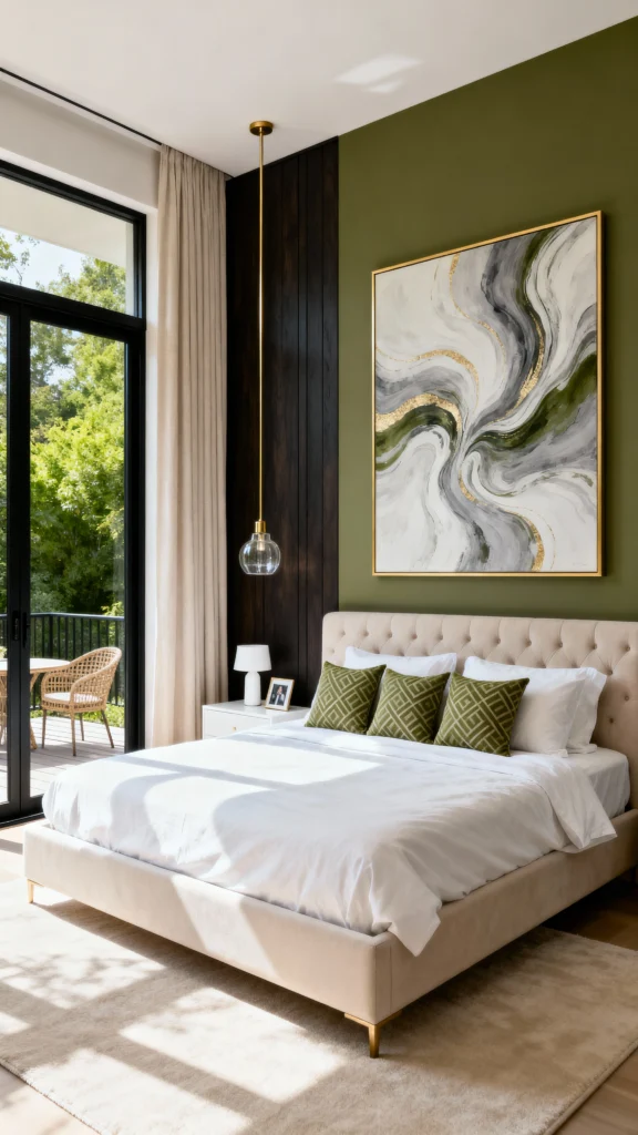 Hang a massive, gold-framed abstract painting with swirling green and white tones to act as the room’s centerpiece. Paint the wall behind it a muted olive green to let the artwork pop. Select a beige, tufted upholstered bed frame for a touch of elegance. Suspend a delicate glass and brass pendant light on one side of the bed for an asymmetrical, high-design look. Keep the bedding white and simple, using green geometric pillows to tie the color scheme together.