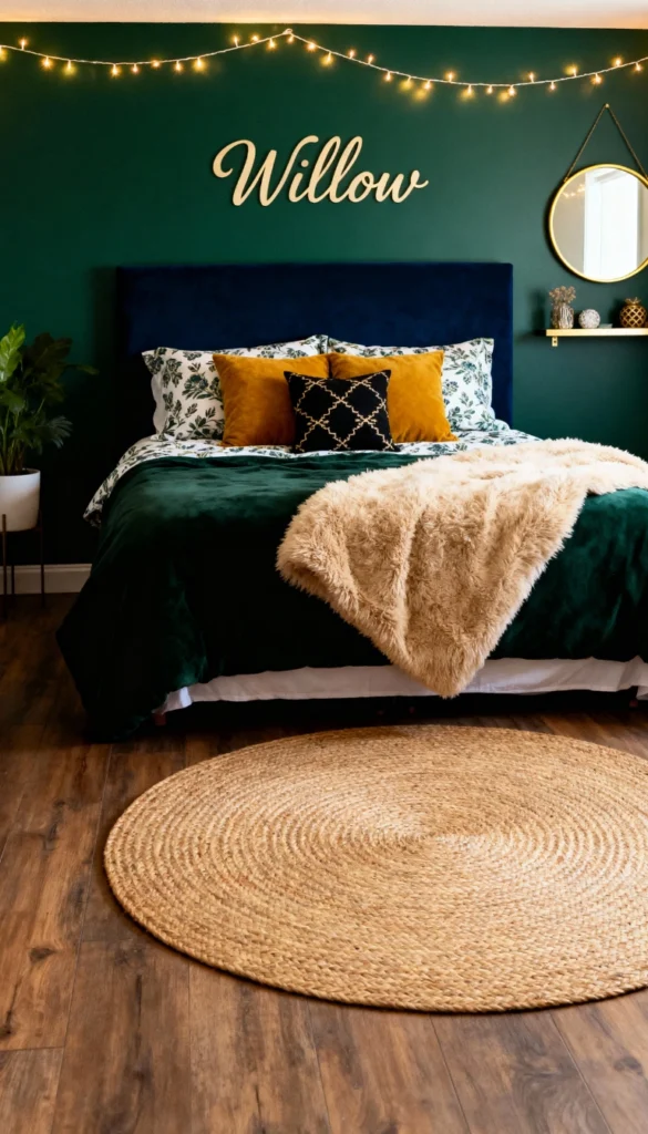 Paint your accent wall a deep, forest green to ground the space. Drape a string of warm fairy lights along the ceiling line for a whimsical, relaxed touch. Layer mustard yellow velvet pillows against floral print shams to mix textures and patterns playfully. Place a large, round jute rug at the foot of the bed to introduce natural, earthy fibers. finish the wall decor with a personalized wooden script sign or a round gold mirror to bounce the light.