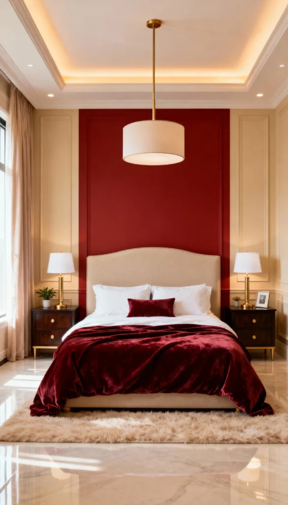 Layer rich, velvet burgundy bedding over crisp white sheets to create a dramatic, high-contrast look. Install warm, recessed ceiling lights or a hidden cove light to cast a soft, glowing halo around the room. Add symmetry by placing matching dark wood nightstands on either side, topped with gold-based lamps. Finish the look with a plush, faux-fur rug in a neutral champagne tone at the foot of the bed for texture.