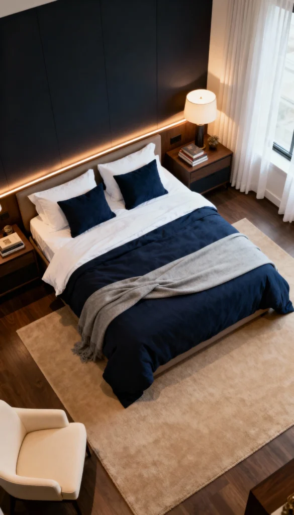 Opt for a sleek, dark wood panel wall behind the bed to add depth and masculinity. Install a warm LED strip light along the top of the headboard to create a cozy, ambient separation between the bed and the wall. Dress the bed in deep navy blue linens paired with a soft grey throw blanket for a sophisticated palette. Place a large, plush neutral area rug underneath the bed to soften the dark wood flooring. Keep the nightstands minimal and modern to maintain clean lines.
