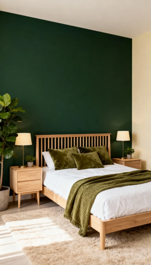 Select a simple, light oak bed frame with a spindle headboard for an airy feel. Match your accent wall to your velvet throw pillows in a rich, moss green hue. Drape a chunky, textured green knit throw casually over the white duvet. Place a tall fiddle leaf fig tree in a concrete pot in the corner to bring life to the empty space. Keep the bedside tables minimal and matching for a clean, uncluttered Scandinavian aesthetic.