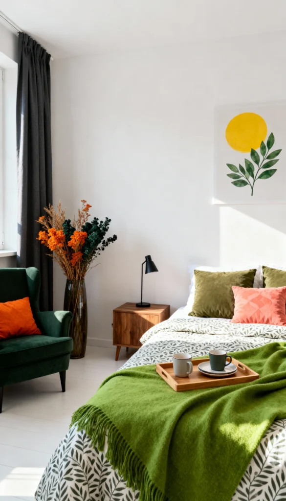 Position a velvet emerald green armchair near the window to create a cozy reading nook. Use bedding with a subtle botanical leaf print to bring the outdoors in. Fill a tall, amber glass vase with dried orange and teal flowers for a natural, long-lasting floral arrangement. Keep the walls stark white to let the sunlight bounce around the room and make the colors pop. Hang a simple nature-inspired print above the bed to tie the green and yellow tones together.
