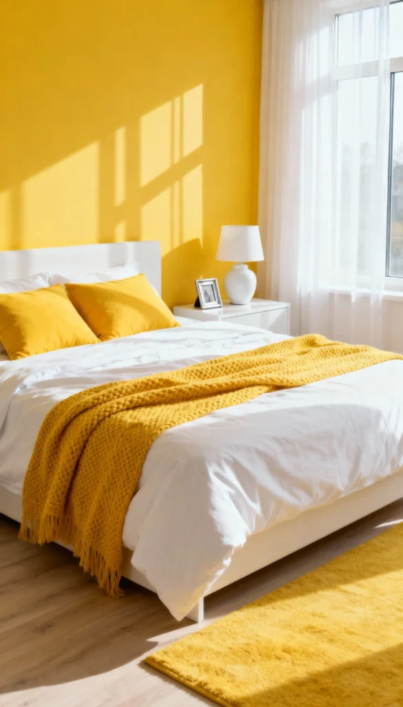 Paint your main wall a vibrant, sunny yellow to instantly lift your mood every morning. Keep the bed frame and sheets pure white to balance the intensity of the wall color. Toss a chunky, mustard-yellow knit blanket across the foot of the bed for cozy texture. Place a simple, rounded white ceramic lamp on a minimal white nightstand for a clean finish. Let the sunlight stream in through sheer white curtains to maintain the bright, airy atmosphere.