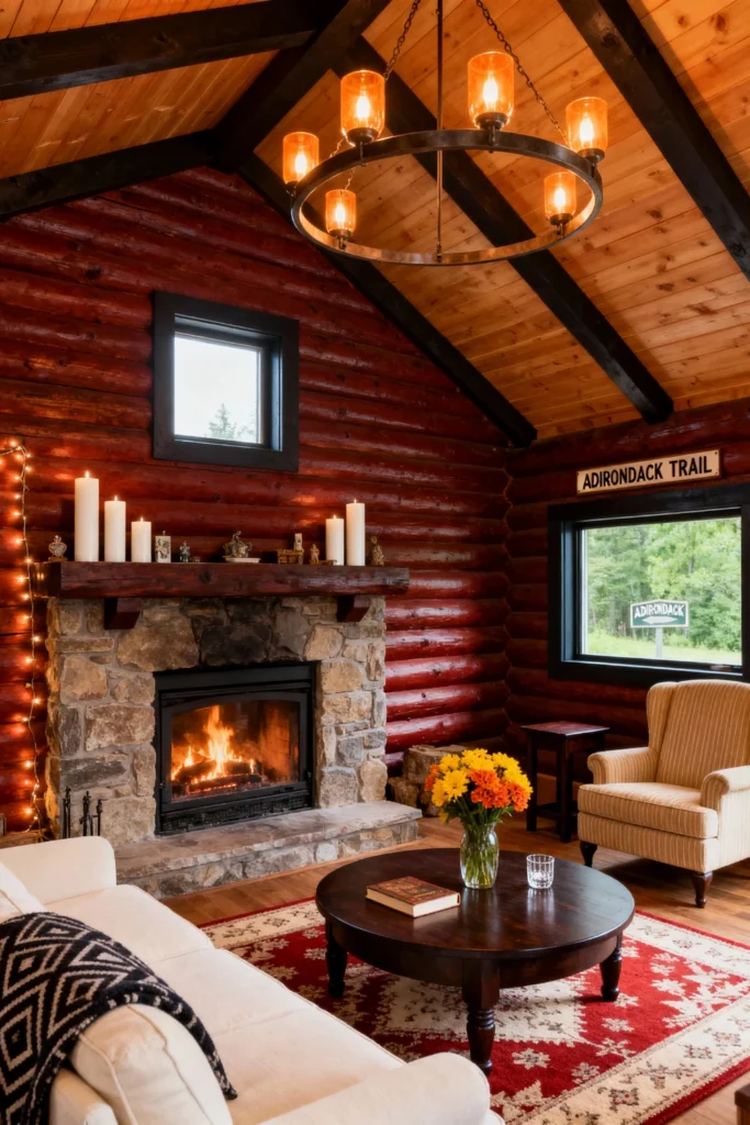 Hang a large, iron wagon-wheel chandelier with amber glass shades to draw the eye up and warm the room. Paint the window trim black to create a sharp contrast against the red log walls. Arrange fresh yellow and orange flowers on a round, dark wood coffee table for a burst of life. Cozy up in a striped beige wingback chair by the window to watch the treeline.
