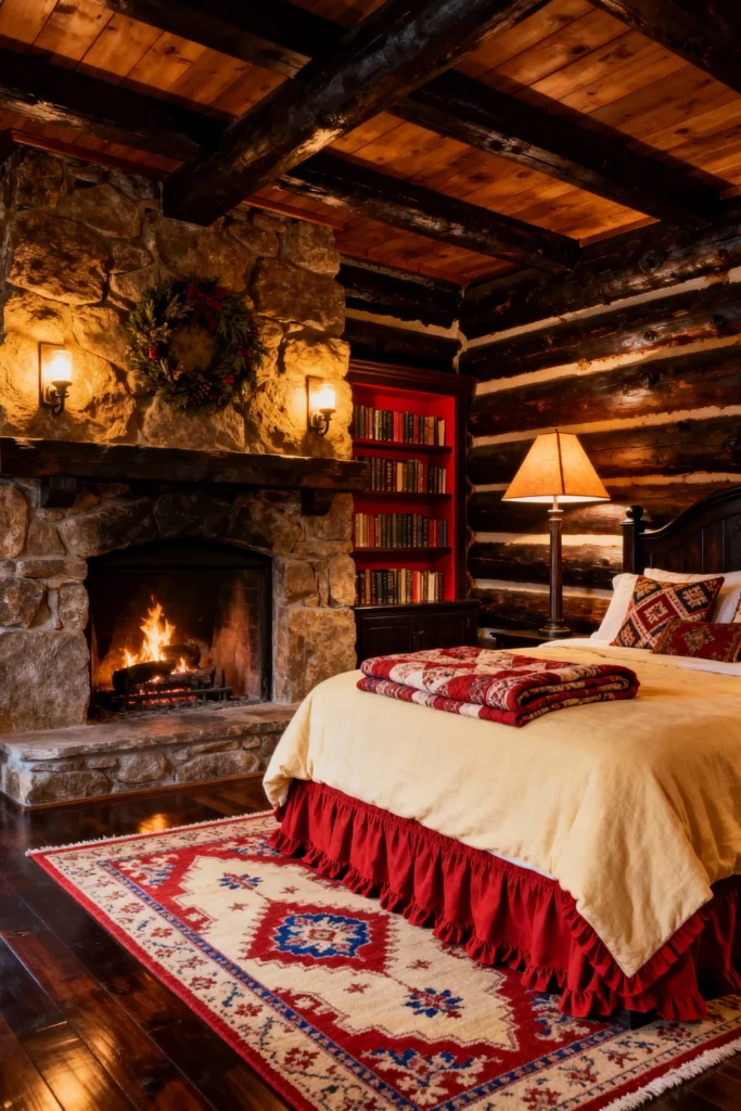Lean all the way into the rustic vibe with dark, hand-hewn log walls and exposed beams. Hang a festive evergreen wreath on the rough stone chimney breast for a touch of greenery. Fill a built-in red bookshelf with your favorite vintage hardcovers to add color and character. Dress the bed with a classic patchwork quilt and a ruffled red dust ruffle. Turn on a warm, yellow-toned lamp to cast a golden, old-world glow over the room.