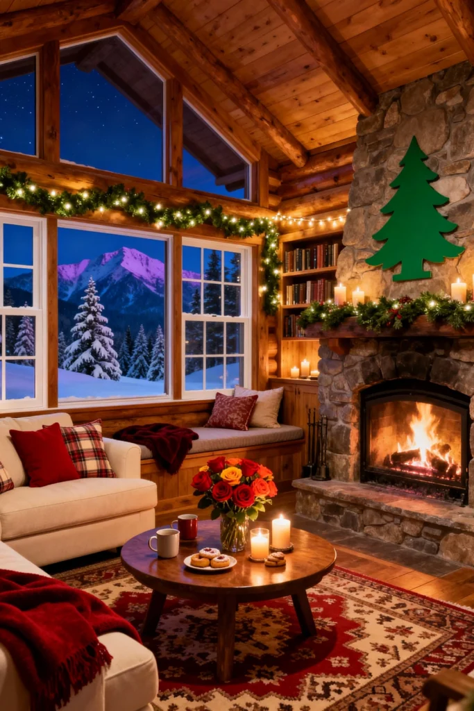 Drape a lighted green garland across the top of the window frame to frame the mountain view. Place a vase of bright red roses and a plate of cookies on the round coffee table. Add red flannel pillows to a cream sofa to inject immediate holiday spirit. Hang a simple, green wooden tree cutout on the stone chimney breast to complete the cheerful, festive look.