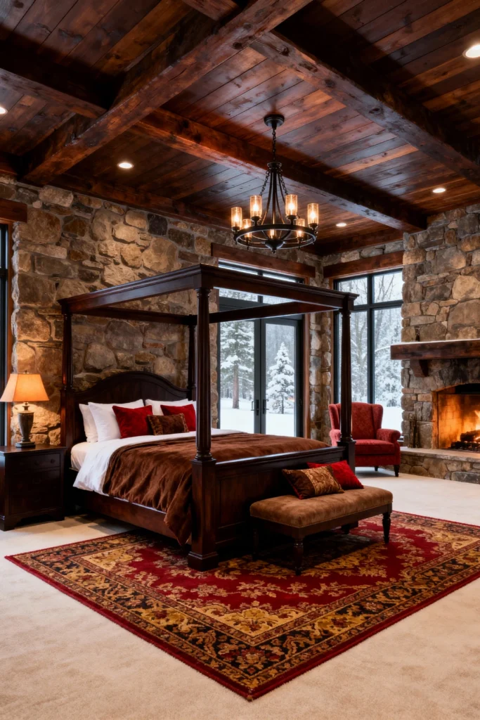 Select a massive, dark wood four-poster bed to act as the grand centerpiece of the room. Layer crisp white linens with a velvety, chocolate-brown throw for rich texture. Position the bed to face the floor-to-ceiling glass doors so you can wake up to the snowy forest view. Add a deep red upholstered armchair in the corner near the hearth. Use a large, traditional area rug to soften the acoustics of the stone walls.