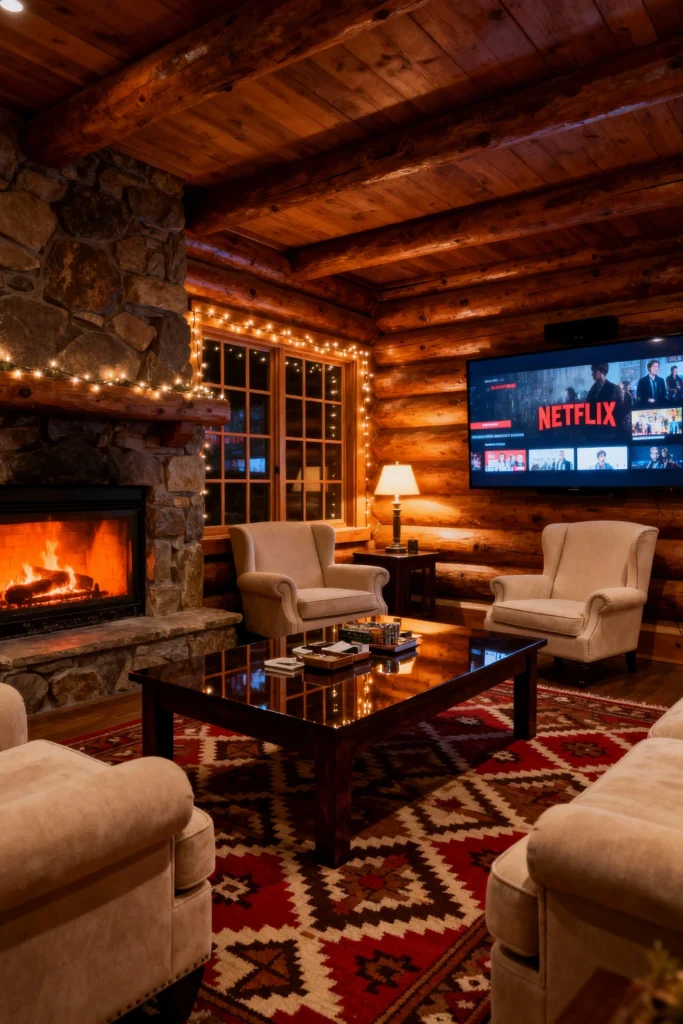 String warm, twinkling fairy lights along the mantle and window frames to create instant magical ambiance. Choose two plush, beige armchairs that practically beg you to sink into them. Anchor the space with a large, geometric rug in deep reds and creams to warm up the wooden floor. Center a glossy, dark wood coffee table between the chairs for your snacks. Finally, mount a large screen above the stone fireplace for the ultimate cozy movie marathon setup.