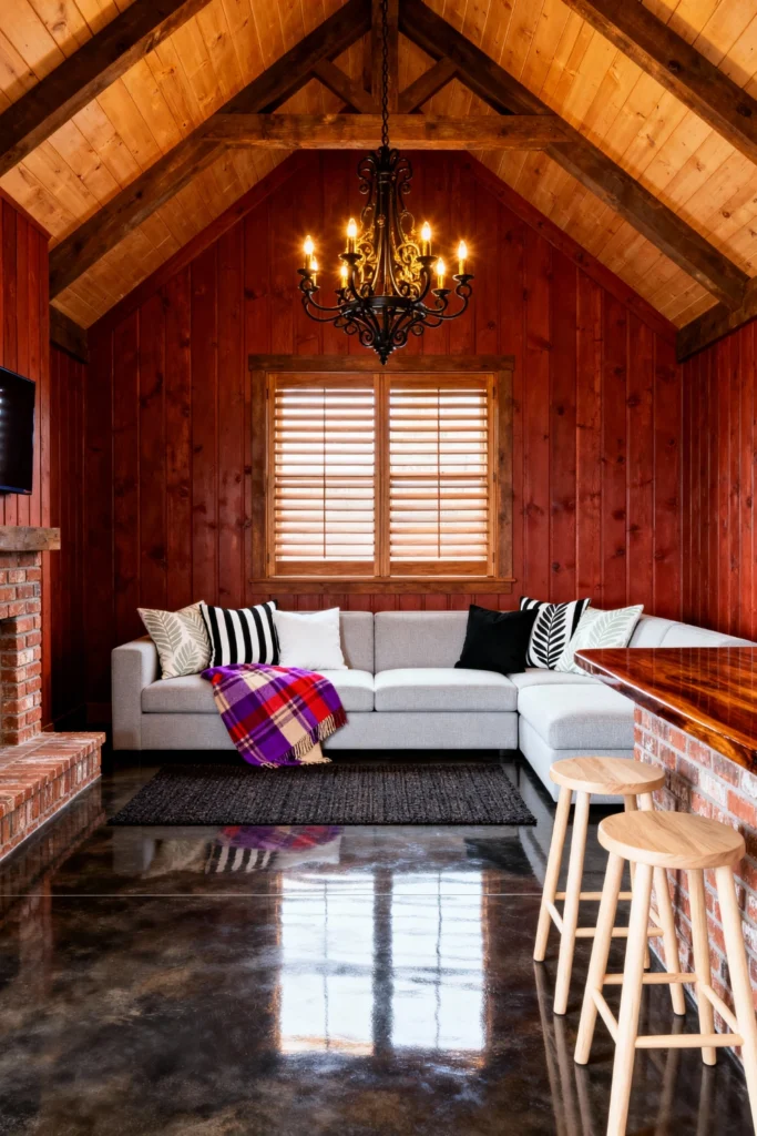 Go bold with vertical red wood paneling to make the walls pop. Contrast the rustic walls with a sleek, high-gloss polished concrete floor for an industrial edge. Arrange a light grey sectional sofa in the corner and toss on a plaid blanket for pattern. Set up simple, light-wood stools at the brick bar counter for a casual breakfast spot. Keep the windows uncovered to let the natural wood tones shine.