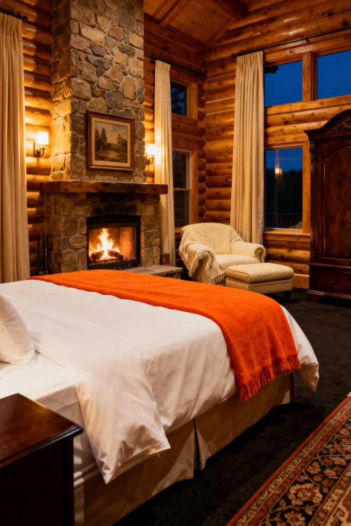 Keep the bedding simple and white, then toss a vibrant orange wool blanket across the foot for a striking pop of color. Place a plush, cream-colored armchair with a matching ottoman near the fire for a reading nook. Incorporate a tall, antique wooden armoire to add height and storage. Frame the large windows with long, floor-length beige curtains to soften the heavy look of the log walls.