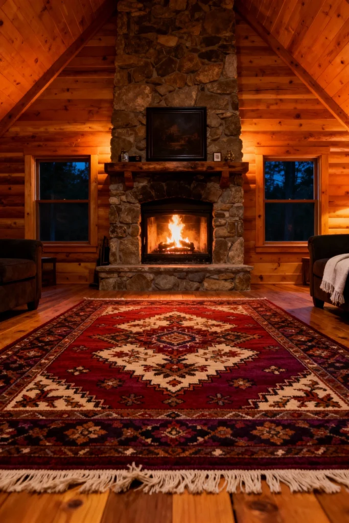 Create perfect symmetry by flanking the central stone fireplace with two identical dark velvet armchairs. Roll out a large, intricate Persian-style rug in deep reds and purples to cover the wide-plank hardwood floor. Place a framed oil painting on the mantle for a touch of traditional elegance. Keep the lighting low and warm to let the roaring fire serve as the room’s main focal point.