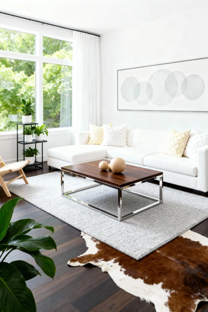 Maximize natural light by keeping your window treatments sheer and simple. Anchor the room with a massive, ultra-crisp white sectional sofa. Layer a soft, light grey textured rug over a natural brown cowhide for unexpected dimension. Choose a sleek coffee table with shiny chrome legs and a rich walnut top. Bring the outdoors in by stacking vibrant green potted plants on a simple black metal stand near the window. Hang a large, minimalist piece of abstract grey art on the wall to maintain that clean, serene vibe.