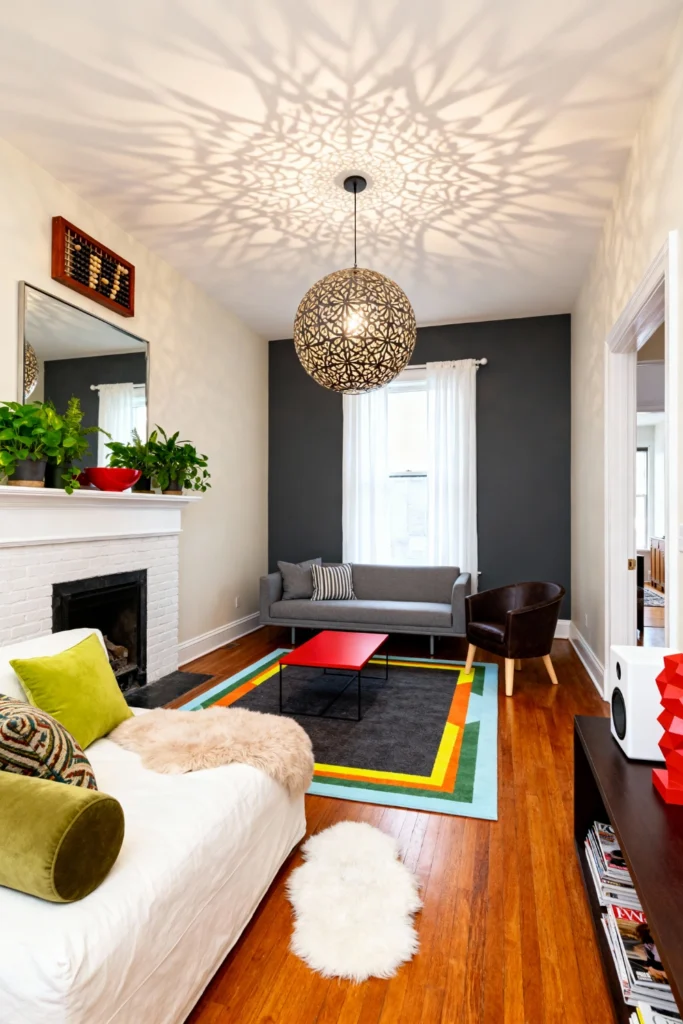 Paint one accent wall a deep, dramatic charcoal grey to make the room pop. Hang a large, intricately cut metal globe pendant light to cast beautiful, mesmerizing shadows across the ceiling. Choose a sleek, low-profile grey sofa to keep things modern. Inject vibrant energy by placing a bright red, minimalist coffee table on top of a rug featuring bold geometric blocks of lime green, orange, and blue. Toss a fuzzy sheepskin throw over the furniture and add lime green accent pillows to tie the whole playful look together.