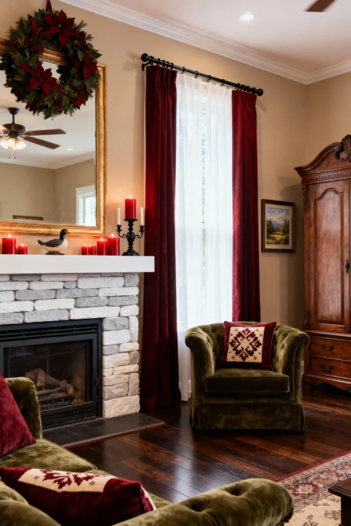 Hang floor-to-ceiling, deep crimson velvet curtains to bring instant drama and luxury to your windows. Anchor a corner with a deeply tufted, olive green velvet armchair. Place an antique, carved wood armoire against a beige wall to add a sense of history and beautiful craftsmanship. Mount a massive, ornate gold-framed mirror above a whitewashed stone fireplace to reflect the light. Arrange a cluster of thick, red pillar candles on the mantle. Lay down a traditional oriental rug with rich red and navy tones to complete this timeless, elegant look.