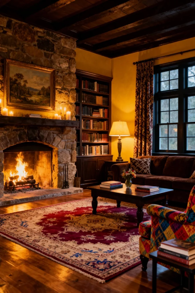 Embrace a moody atmosphere by painting your walls a warm, golden mustard. Anchor the space with a large, plush brown velvet sofa. Lay down a rich, deep red patterned rug to bring the room together. Frame a stunning floor-to-ceiling stone fireplace with dark wood built-in bookshelves filled with your favorite vintage reads. Add a brightly colored, patchwork-style armchair for a fun pop of personality. Finally, keep the lighting low and inviting with warm table lamps and a roaring fire to create the ultimate cozy retreat.