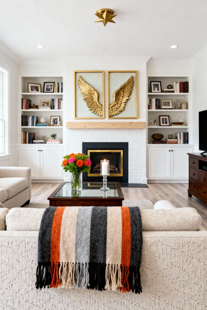 Start with a bright, white-painted brick fireplace as your stunning focal point. Flank the fireplace with crisp white built-in cabinets and shelves, styling them carefully with framed photos and curated books. Hang a dramatic set of large, gold-painted angel wings right above the wooden mantle. Keep your seating neutral with plush cream-colored sofas. Choose a dark cherry wood coffee table with a glass top to keep the center feeling open.