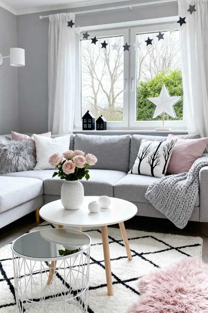 Paint your walls a soft, soothing dove grey to create a calm backdrop. Arrange a light grey sectional sofa and load it up with plush pink velvet pillows and graphic tree-print cushions. Drape a chunky knit grey blanket casually over the armrest. Pair a simple white wooden coffee table with a geometric wire side table to keep things airy. Lay down a fluffy white rug with thin black geometric lines, and add a small, faux-fur pink rug for extra texture. Hang a playful star garland across the window for a sweet finish.