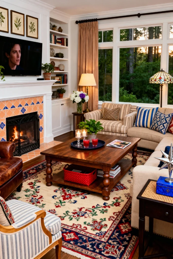 Frame your fireplace with vibrant, Spanish-style blue and orange patterned tiles to make it a true centerpiece. Mix and match your seating by pairing a rich brown leather armchair with a classic striped fabric chair. Anchor the room with a massively chunky, turned-leg wooden coffee table. Lay down a traditional rug featuring deep reds, blues, and floral motifs. Decorate the mantle with framed botanical prints to bring a touch of nature indoors. Use a stained-glass Tiffany-style floor lamp in the corner to add a vintage, colorful glow.