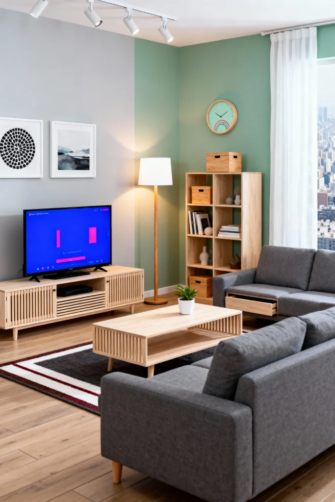 Divide your wall color with a calming split of soft grey and muted sage green. Opt for matching, tailored grey sofas with clean lines and exposed wooden legs. Use a slatted light-oak coffee table and a matching TV console to add beautiful texture without visual clutter. Display your books and storage boxes neatly in a tall, open-backed wooden shelving unit. Stand a simple wood-and-white floor lamp in the corner to cast a soft glow. Finish the look with a playful, pastel wall clock for a touch of whimsy.