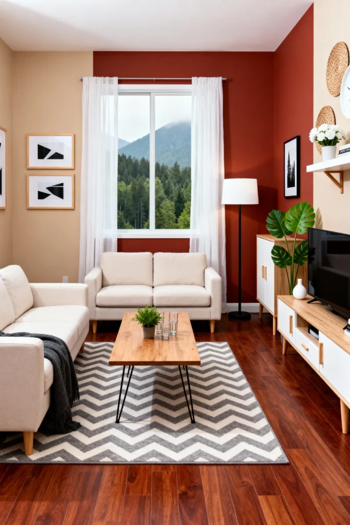 Paint a bold, terracotta-red accent wall to bring instant warmth to your living area. Place matching cream-colored loveseats opposite each other for easy conversation. Ground the seating area with a classic grey and white chevron patterned rug. Choose a natural wood coffee table with black metal hairpin legs for that iconic mid-century feel. Use a sleek, two-toned white and wood media console to hide your electronics. Decorate the walls with simple black-and-white abstract art and woven wall baskets to add texture and subtle charm.
