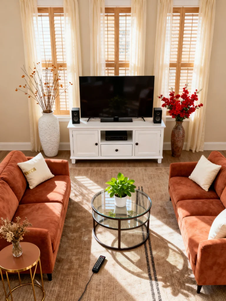 Embrace earth tones by selecting velvet sofas in a deep, inviting burnt orange. Arrange them facing each other to prioritize conversation over screen time. Place a round glass coffee table in the center to keep the visual flow open and airy. Use tall, sheer beige curtains to filter the sunlight gently. Add large ceramic vases with tall dried branches or red flowers to heighten the seasonal feel. Keep the rug neutral and textured to let the furniture color pop.