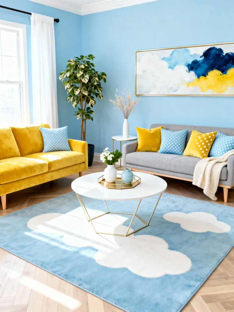 Paint your walls a crisp sky blue to mimic a clear summer day. Ground the space with a whimsical blue rug featuring fluffy white cloud shapes. Choose a bright yellow velvet sofa for a sunshine effect, contrasting it with a soft grey loveseat. Use a modern, white round coffee table with gold legs for a clean look. Accessorize with polka dot pillows to keep the vibe playful and lighthearted. Add a lush variegated plant for a touch of life.