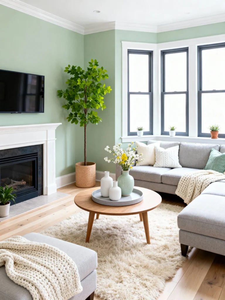 Soften the room with calming mint green walls. Utilize a bay window by keeping it open and airy with minimal decor—just a few small plants. Choose a light grey sectional sofa for maximum comfort without visual weight. Anchor the room with a round wooden coffee table and a trio of white ceramic vases. Use a high-pile, fluffy white rug to add texture and warmth underfoot. Place a tall, leafy tree in a woven basket to bring the outdoors in.
