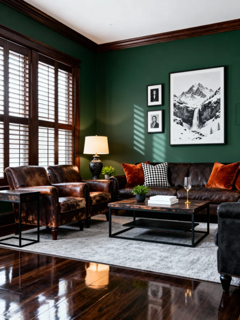 Go bold with deep forest green walls to create a cocoon-like atmosphere. Pair this darkness with rich, distressed leather furniture in chocolate browns for a masculine edge. Use a coffee table with a raw wood top and black metal frame for an industrial touch. Hang large-scale black and white nature photography to break up the color. Let the natural light hit polished dark wood floors for a sophisticated, gentleman’s lounge aesthetic. Add a classic lamp with a black shade.