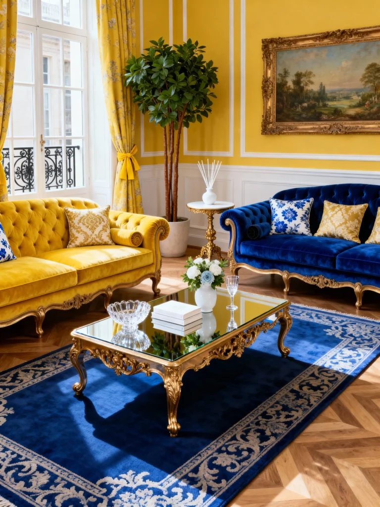 Channel European royalty with a striking color palette of royal blue and mustard yellow. Select a tufted velvet sofa with ornate, gold-gilded legs. Lay down a rich blue rug with classic patterns to anchor the seating area. Use a mirrored coffee table with gold detailing to reflect light and add glamour. Add a tall, manicured tree in a stone pot for grandeur. Hang a large, classic oil landscape painting in a heavy gold frame to complete the palace look.